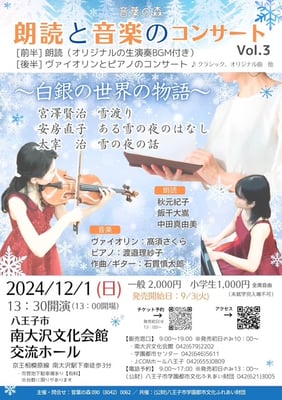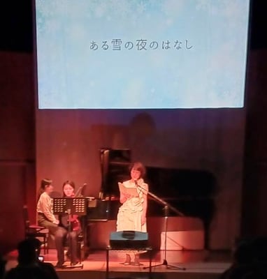 宮澤賢治「雪渡り」・太宰治「雪の夜の話」・安房直子「ある雪の夜のはなし」の朗読にヴァイオリンとピアノのBGMを入れ、後半はミニコンサートを楽しんでいただきました。
